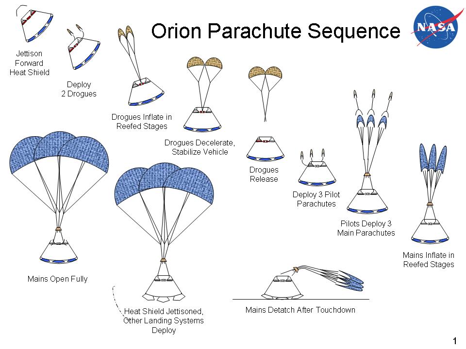 De hogyan zajlik a légköri visszatérés utolsó szakasza? Mintegy 7600 m magasan megkezdődik az ejtőernyős fékezés. Először két, egyenként mintegy 7 m átmérőjű stabilizáló ernyő nyílik ki. Ezek feladata egyrészt a kabinnak a főernyők nyitásához megfelelő helyzetbe állítása, másrészt egy olyan sebességre (500 km/h) lassítása, hogy a nagyméretű főernyők a nyitáskor ne szakadjanak szét. Nagyjából 3000 méteren és 210 km/h-sebességnél leválasztják a két stabilizáló ernyőt, majd pirotöltetek kilőnek három, egyenként 330 cm átmérőjű kihúzóernyőt, amelyek teljes méretre lobbanásukkal együtt kihúzzák a tokból a három (35 m átmérőjű) főernyőt. Ezek a 27 km/h-s (7,5 m/s) sebességig lassítják a kabint, amely majd ezzel a sebességgel csobban a Csendes-óceánba.